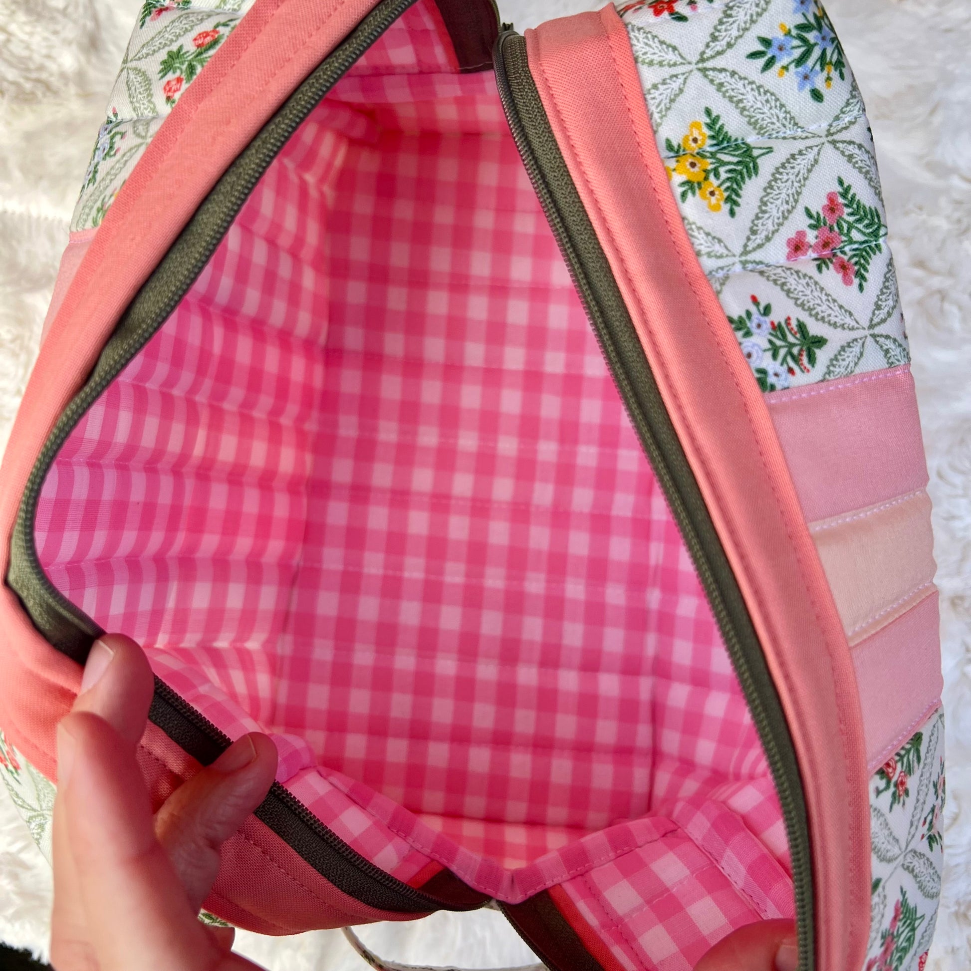 Outer fabric: Rifle Paper Co. floral in cream, greens, blues, pinks and yellows with peach and coral Stripes