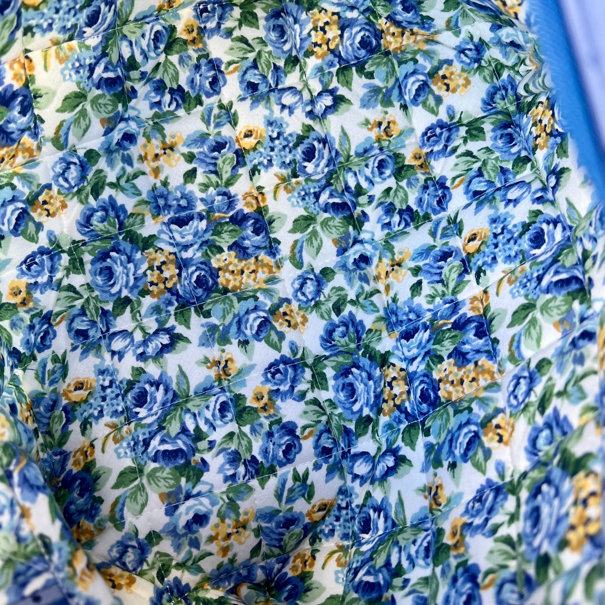 Outer fabric: A variety of blues, greens and neutrals in a 4-patch quilt design